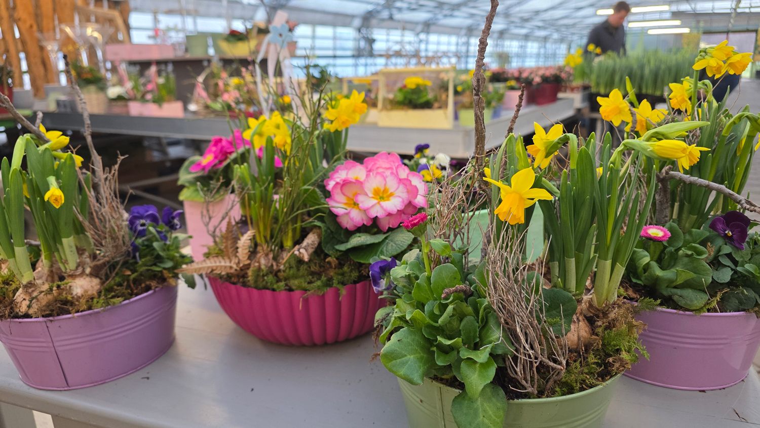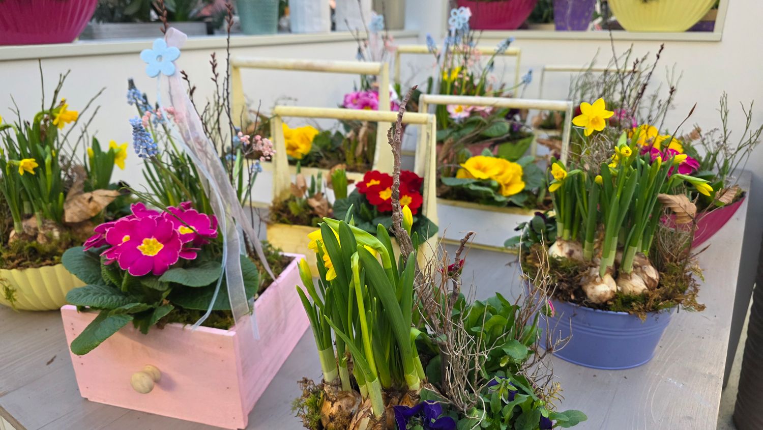 Wunderschöne Arrangements mit Primeln, Traubenhyazinthen, Narzissen, Ministiefmütterchen (Hornveilchen) in unterschiedlichsten Farben und vieles mehr ...